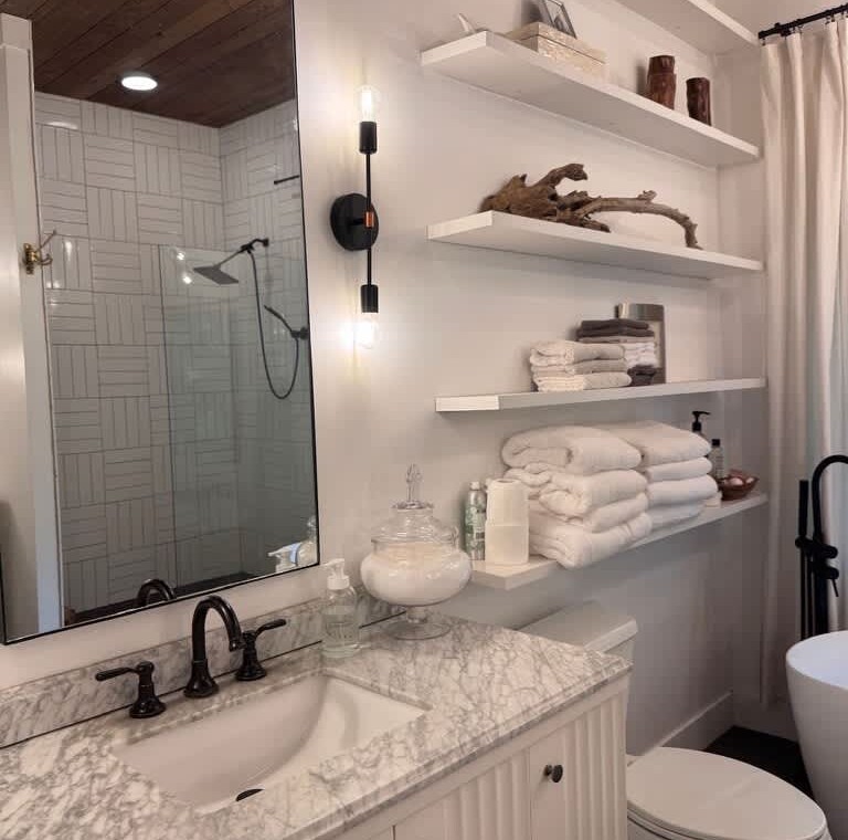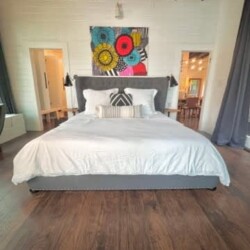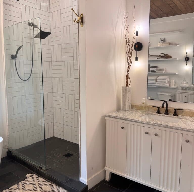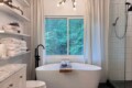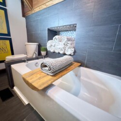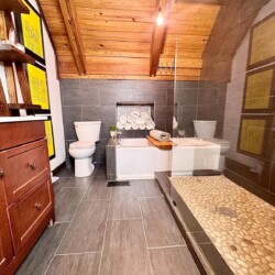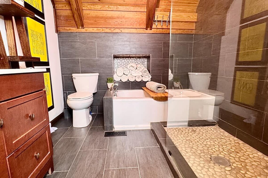 Primary Suite (Main Level): King bed, ensuite bath, soaking tub + walk-in shower