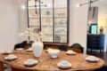 Modern, fully stocked kitchen ready for family meals — stainless steel appliances, ample counter space, and seating for everyone at the farmhouse-style table with lake views.